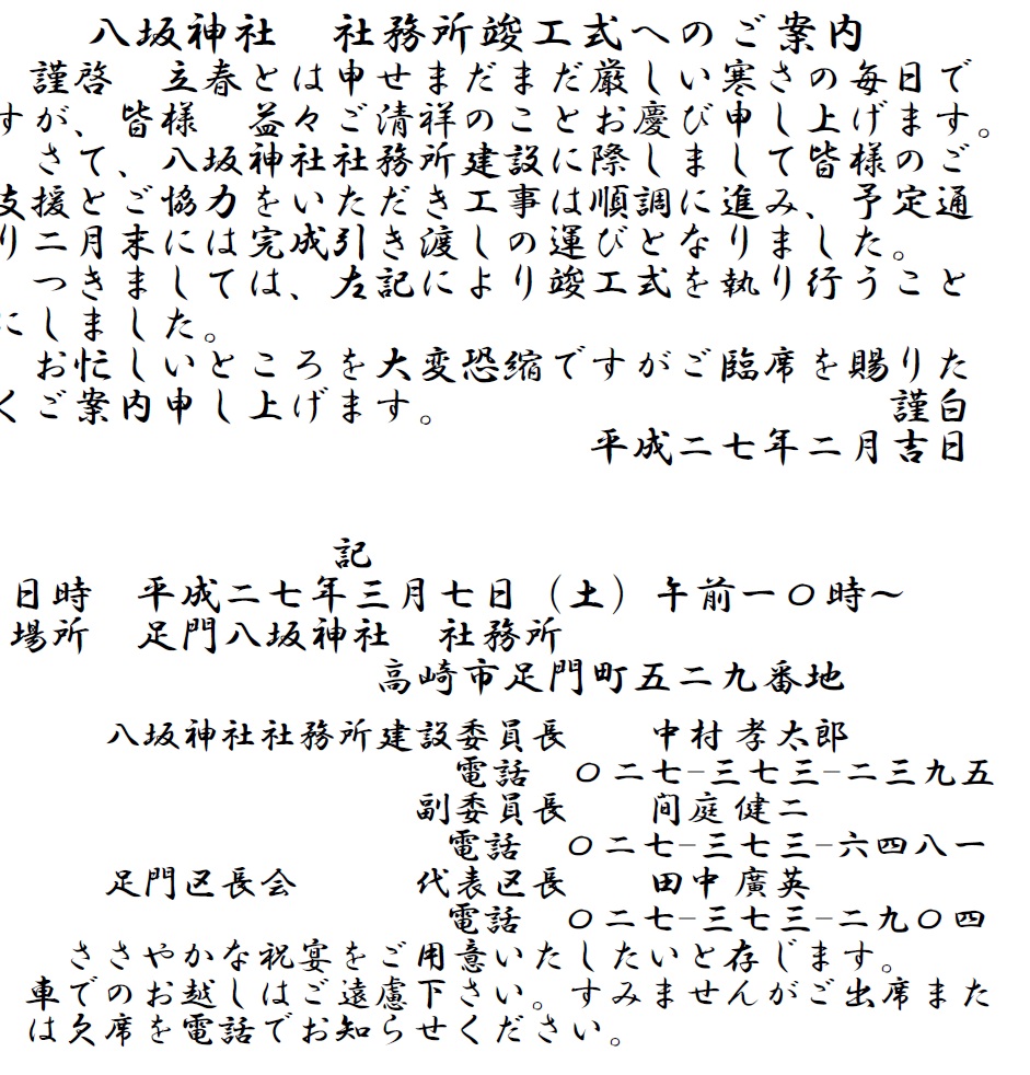 足門八坂神社 社務所竣工式 平成27年3月7日